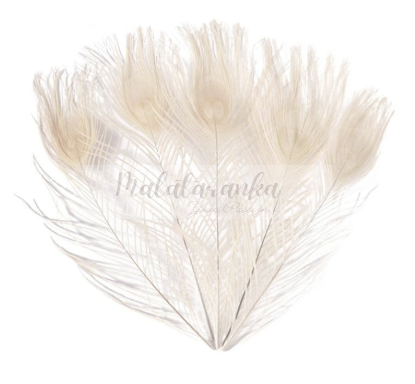 Naturalne wybielone piękne pióro pawia. Idealne do zdobienia przedmiotów, ubrań, kapeluszy, kostiumów. Używane do wykonywania biżuterii, łapaczy snów, Świetnie sprawdzają się jako element dekoracji sal weselnych, stołów, wiązanek ślubnych, prezentów, dekoracji samochodów, choinki, stołów wigilijnych, witryn sklepowych.