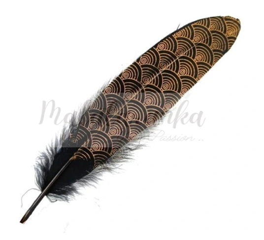 Piękne ozdobne pióro gęsi, lotka w luksusowych złotych barwach. Idealne do zdobienia przedmiotów, ubrań, kapeluszy, kostiumów. Używane do wykonywania biżuterii, łapaczy snów, Świetnie sprawdzają się jako element dekoracji sal weselnych, stołów, wiązanek ślubnych, prezentów, dekoracji samochodów, choinki, stołów wigilijnych, witryn sklepowych.