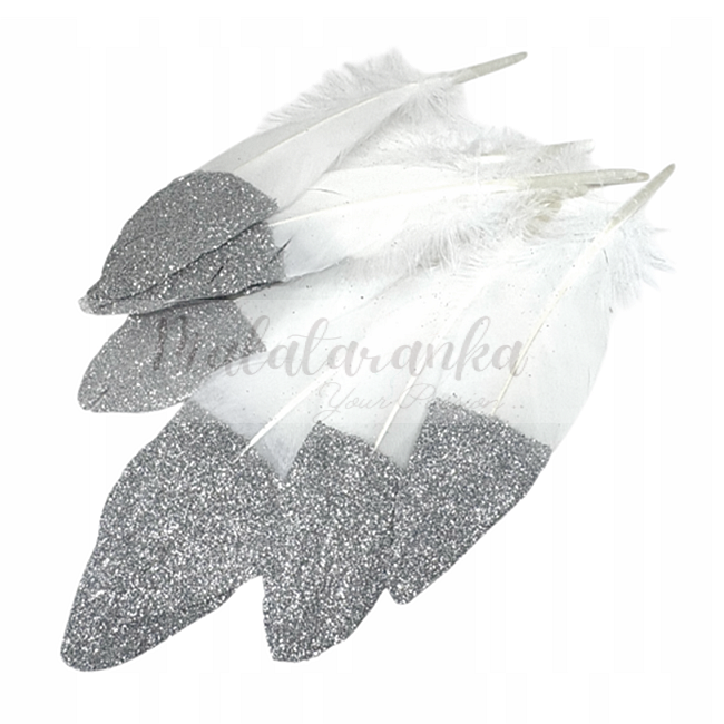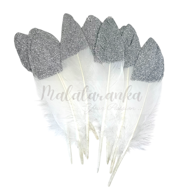 Pióra gęsi lotki Długie 15-20 cm BIAŁO SREBRNE Brokat 10 szt