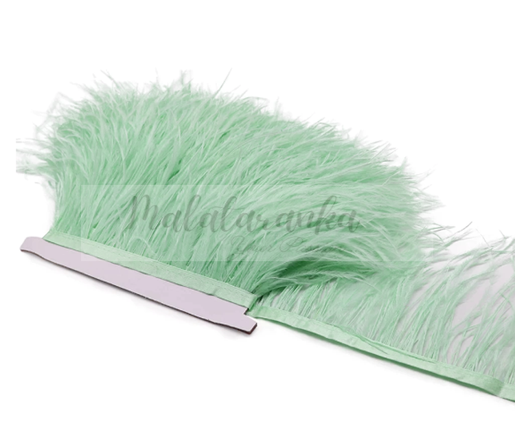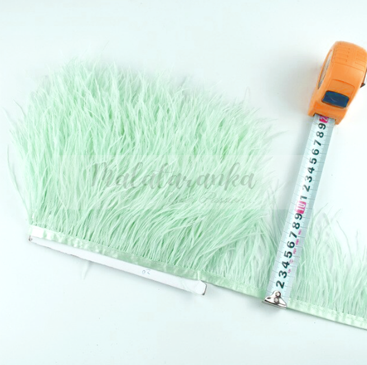 Pióra równomiernie umocowane na dopasowanej kolorystycznie satynowej taśmie, dzięki czemu z łatwością użyjesz tych piór jako wykończenie sukienki, torebki, butów, kapeluszy..